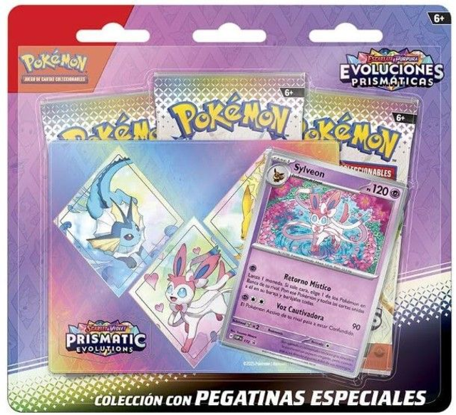 ¡Une tus fuerzas a Leafeon, Glaceon o Sylveon! ¡Abre los tres paquetes de mejora de Escarlata y Púrpura-Evoluciones Prismáticas, consigue una carta holográfica de promoción especial y lleva a tus Pokémon favoritos contigo gracias a las pegatinas disponibles solo en esta colección!